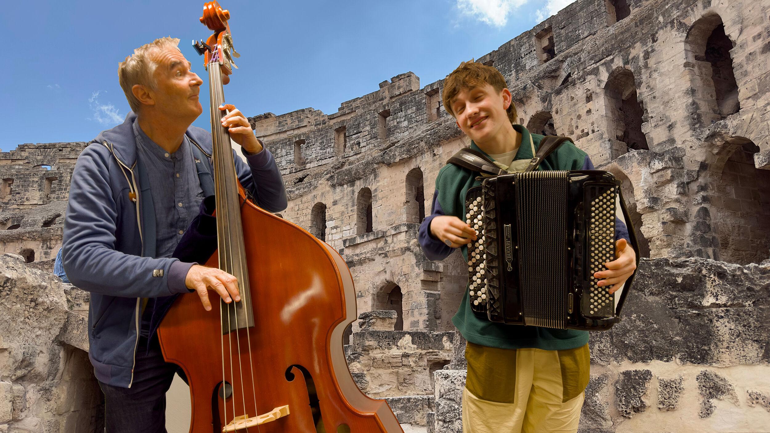 Mit Kontrabass und Akkordeon nehmen die beiden Musiker das Publikum auf eine Weltreise mit. Mit Tango über Musette bis Drum’n’Bass reist dieses Duo auf verschiedene Kontinente und würzt die Stücke mit jazziger Improvisation.